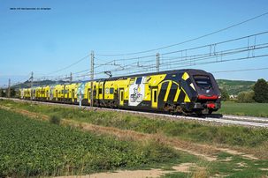ETR.521.002 di Trenitalia Tper in livrea “Tour de France”, celebrativa delle due tappe dell’edizione 2025 svoltesi in Emilia Romagna nonché di campioni quali Gino Bartali, Marco Pantani e Fausto Coppi, ritratto nei pressi di Santa Giuletta il 29 luglio (foto S. Viganò).